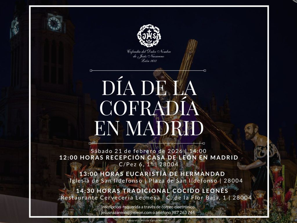 La Cofradía del Dulce Nombre de Jesús Nazareno celebrará el sábado 21 de febrero su tradicional Día de la Cofradía en Madrid, una jornada de convivencia que reunirá a hermanos llegados desde distintos puntos de la geografía nacional.