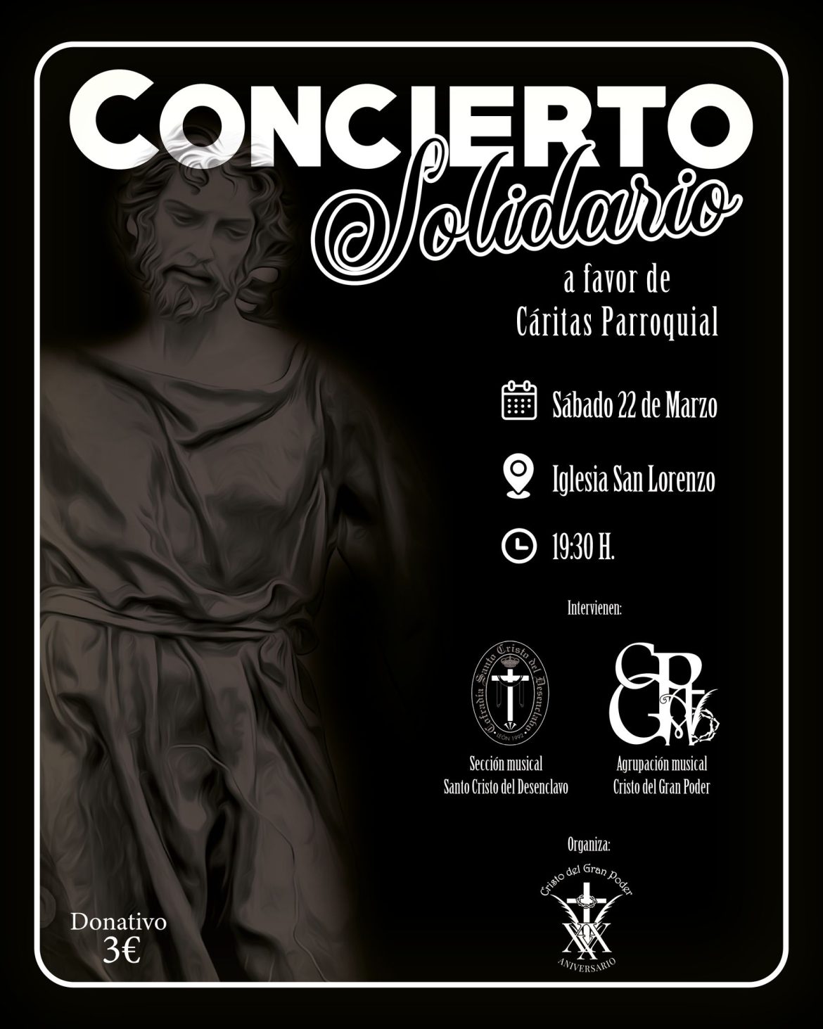 El próximo sábado 22 de marzo a las 19:30 horas, la Iglesia de San Lorenzo se convertirá en el escenario del Concierto Solidario organizado por la Cofradia del Gran Poder , cuya recaudación estará destinada íntegramente a Cáritas Parroquial.