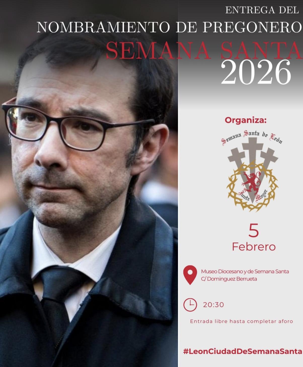 La Semana Santa de León ya tiene voz oficial para su próximo pregón. Este jueves, 5 de febrero, se llevará a cabo el acto de entrega del nombramiento como Pregonero 2026 a Carlos García Rioja. El evento tendrá lugar a las 20:30 horas en el Museo Diocesano y de Semana Santa (C/ Mariano Domínguez Berrueta), con entrada libre hasta completa aforo.