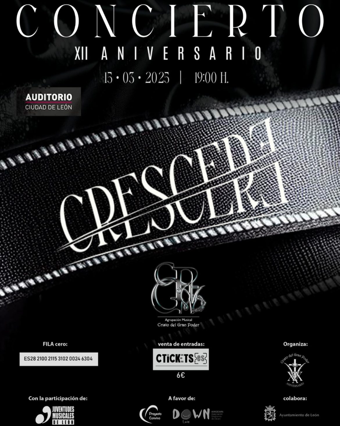 La Agrupación Musical Cristo del Gran Poder de León conmemorará un año más su trayectoria con un concierto muy especial titulado “Crescere”, que rendirá homenaje al esfuerzo y dedicación de todos sus músicos. El concierto tendrá lugar el próximo 15 de marzo a las 19:00 horas en el auditorio Ciudad de León. La recaudación será íntegramente a beneficio de Amidown y Proyecto Convivo.