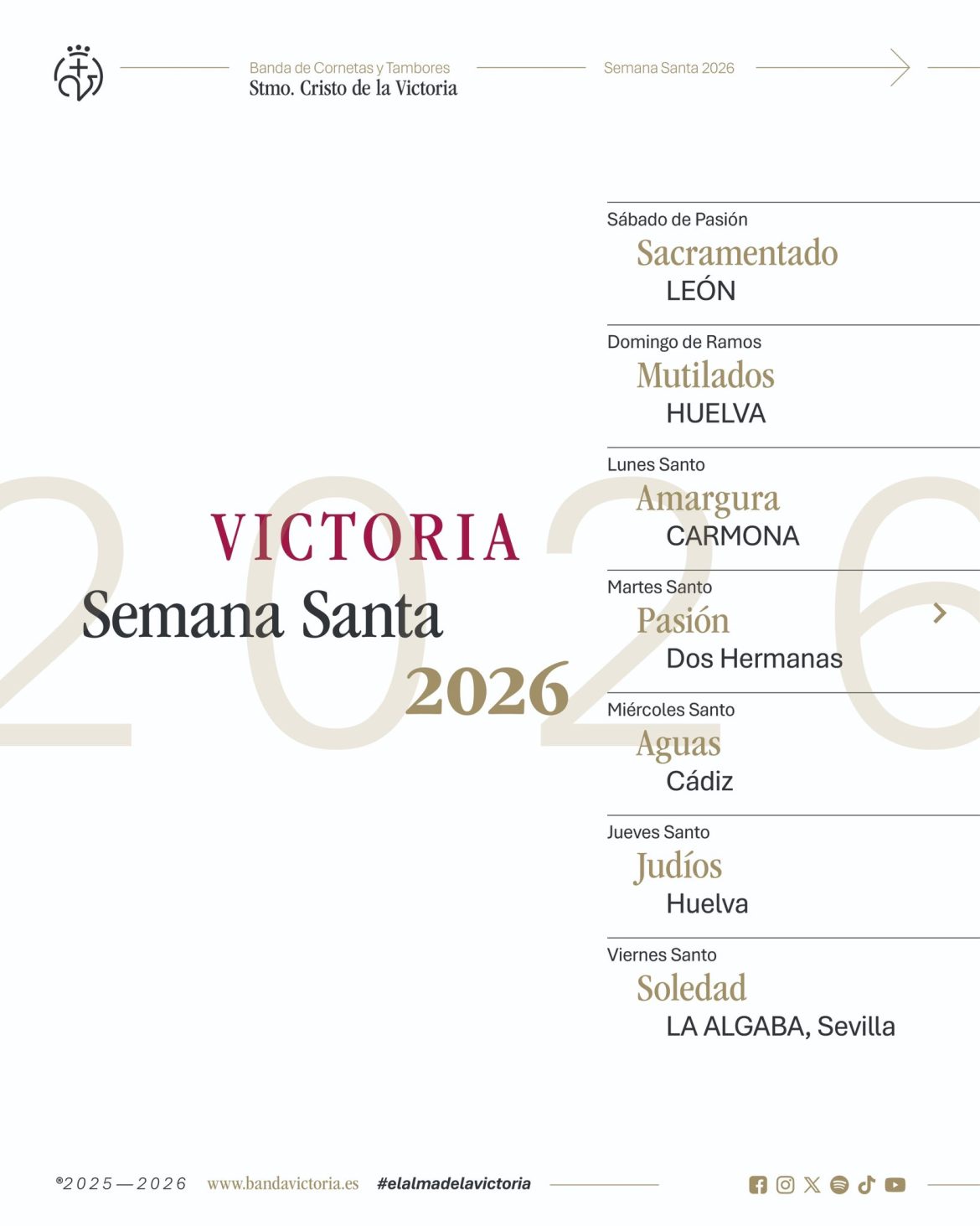 La Banda de Cornetas y Tambores del Santísimo Cristo de la Victoria, con sede en León, ha hecho público su calendario oficial para la Semana Santa 2026, en el que vuelve a participar en algunos de los desfiles procesionales más destacados del país.