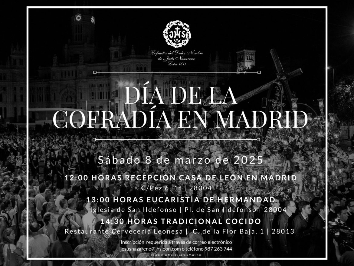 La Cofradía del Dulce Nombre de Jesús Nazareno celebrará el próximo 8 de marzo, sábado, su ya tradicional Día de la Cofradía en Madrid. Esta jornada dará comienzo con un encuentro en la Casa Regional de León, sita en la calle del Pez nº 6 de Madrid, a partir de las 12:00 horas para posteriormente dirigirnos a la Iglesia de San Ildefonso, en la Plaza del mismo nombre, donde tendrá lugar una Solemne Eucaristía de hermandad a las 13:00 horas.