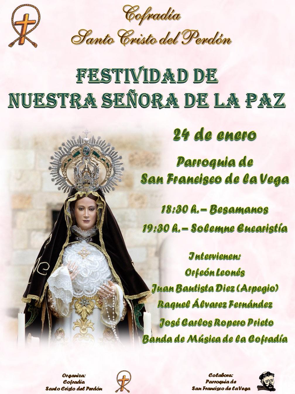 La Cofradía del Santo Cristo del Perdón celebrará el próximo sábado 24 de enero la Festividad de Nuestra Señora de la Paz con un acto solemne en honor a su titular mariana, la Madre de la Paz, en su sede canónica, la Iglesia Parroquial de San Francisco de la Vega.