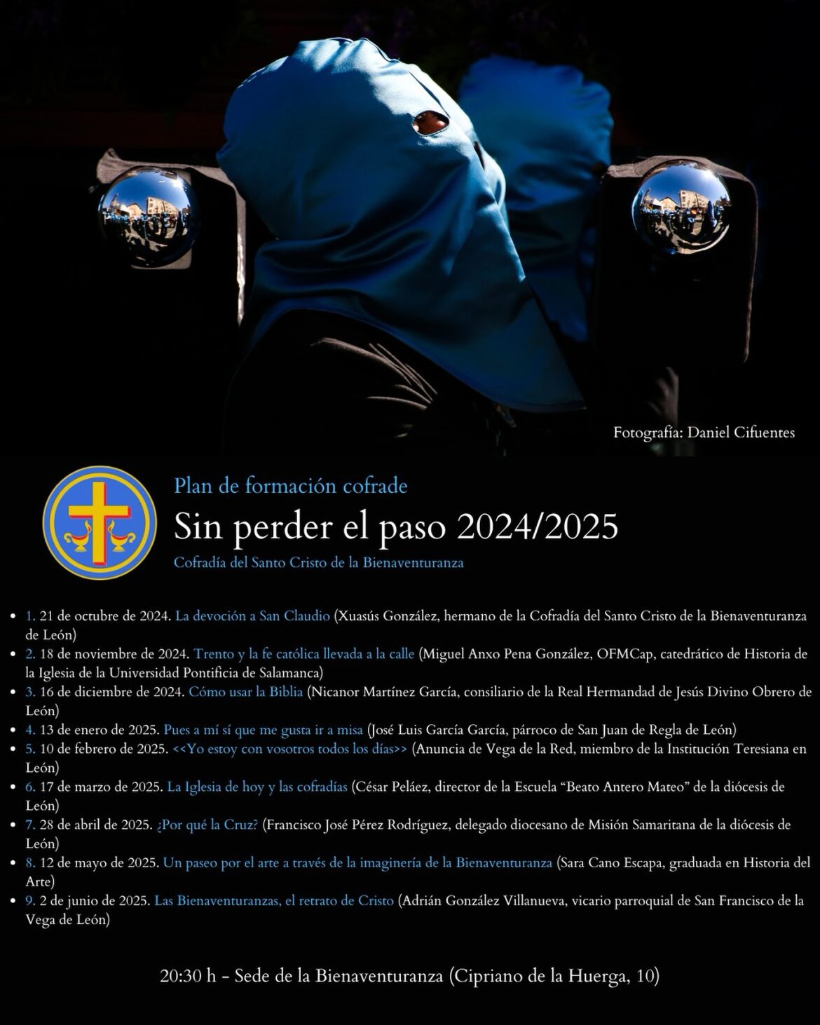 La Cofradía del Santo Cristo de la Bienaventuranza de León ha presentado su nuevo Plan de Formación Cofrade para el periodo 2024/2025, bajo el título «Sin perder el paso». Este ciclo de conferencias, que se extenderá desde octubre de 2024 hasta junio de 2025, busca profundizar en temas fundamentales para la vida cofrade y la espiritualidad cristiana, ofreciendo un espacio de reflexión, formación y crecimiento personal para todos los participantes.