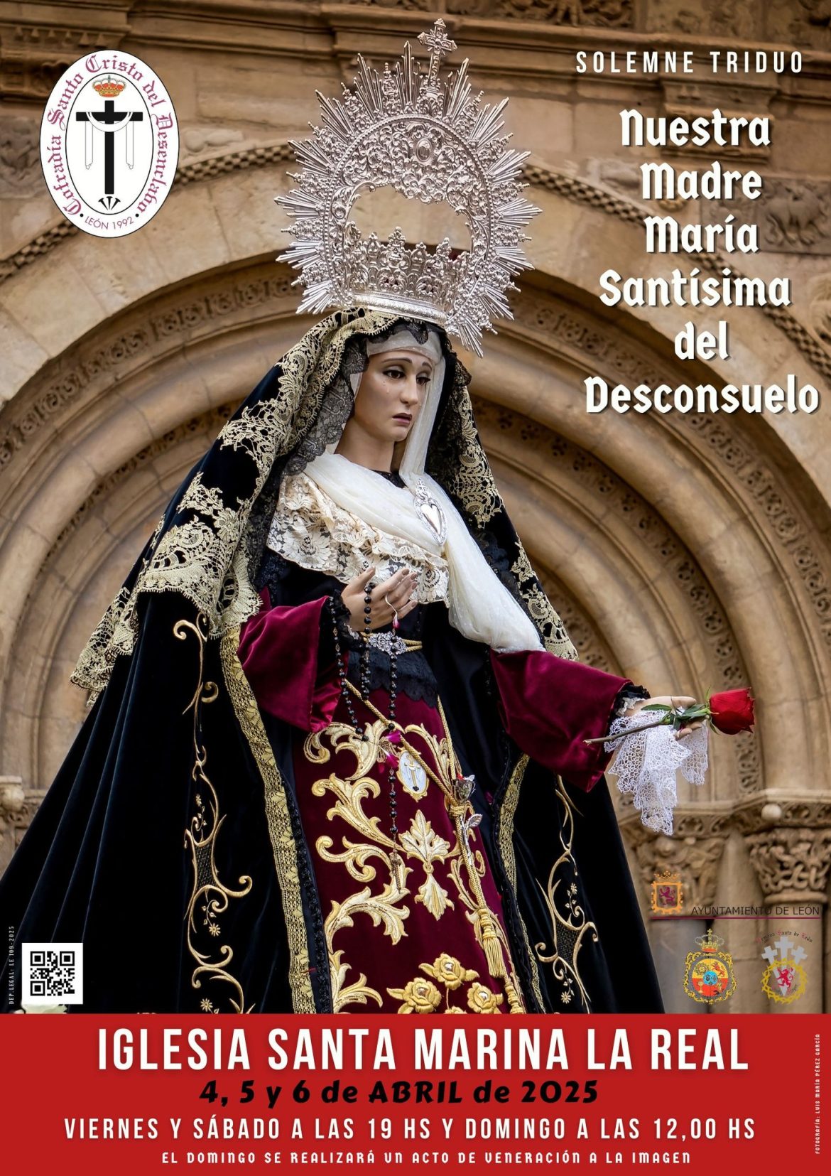 La Cofradía Santo Cristo del Desenclavo invita a todos los fieles y devotos a participar en el Solemne Triduo en honor a Nuestra Madre María Santísima del Desconsuelo, que se celebrará los días 4, 5 y 6 de abril en la Iglesia de Santa Marina la Real de León.