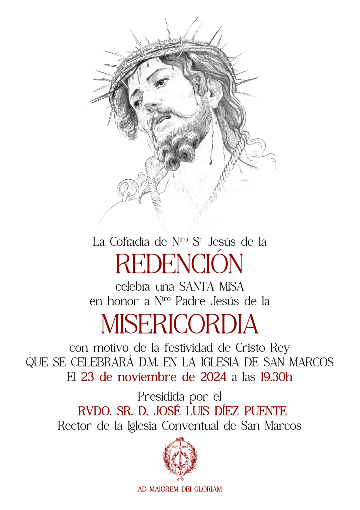 A pesar de la ausencia temporal de la venerada imagen de Nuestro Padre Jesús de la Misericordia, que se encuentra en Valladolid como parte de la exposición “Luisa Roldán. Escultora Real”, la Cofradía de la Redención no dejará de rendirle homenaje en la víspera de la festividad de Cristo Rey.