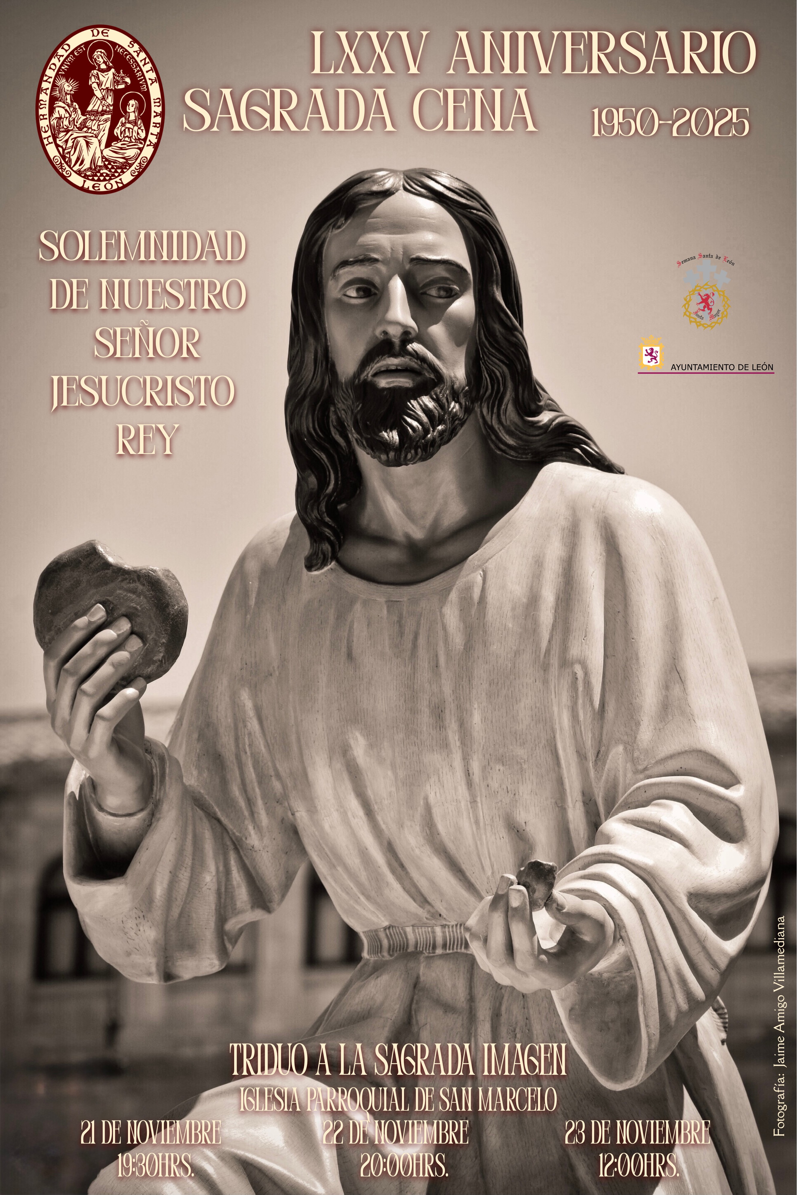 La Hermandad Sacramental de Santa Marta y de la Sagrada Cena celebrará este fin de semana el Solemne Triduo a Cristo Rey, con motivo del 75º aniversario del paso de la Sagrada Cena (1950-2025). Los cultos se desarrollarán los días 21, 22 y 23 de noviembre en la iglesia de San Marcelo, sede canónica de la corporación. La Sagrada Imagen de Nuestro Señor Jesucristo, obra de Víctor de los Ríos y pieza central del conjunto escultórico, presidirá los actos desde el presbiterio del templo.