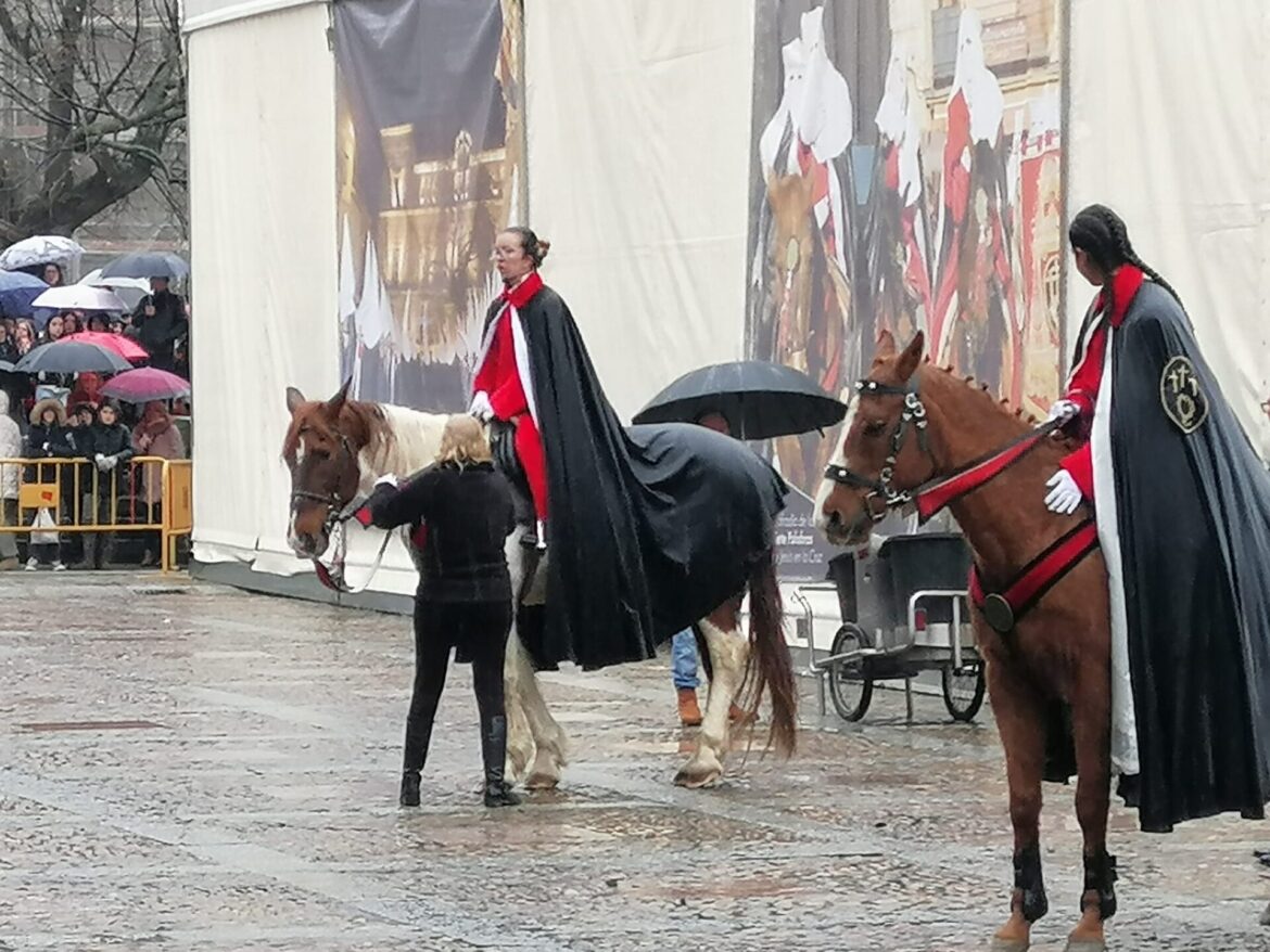 A la hora prevista, 12:30 horas, pero con una lluvia de justicia ha tenido lugar el Pregón a caballo de la Cofradía de las Siete Palabras de Jesús en la Cruz. La procesión a caballo se ha suspendido por el mal tiempo y solo ha tenido lugar el pregón en el Ayuntamiento de San Marcelo con todas las autoridades.
