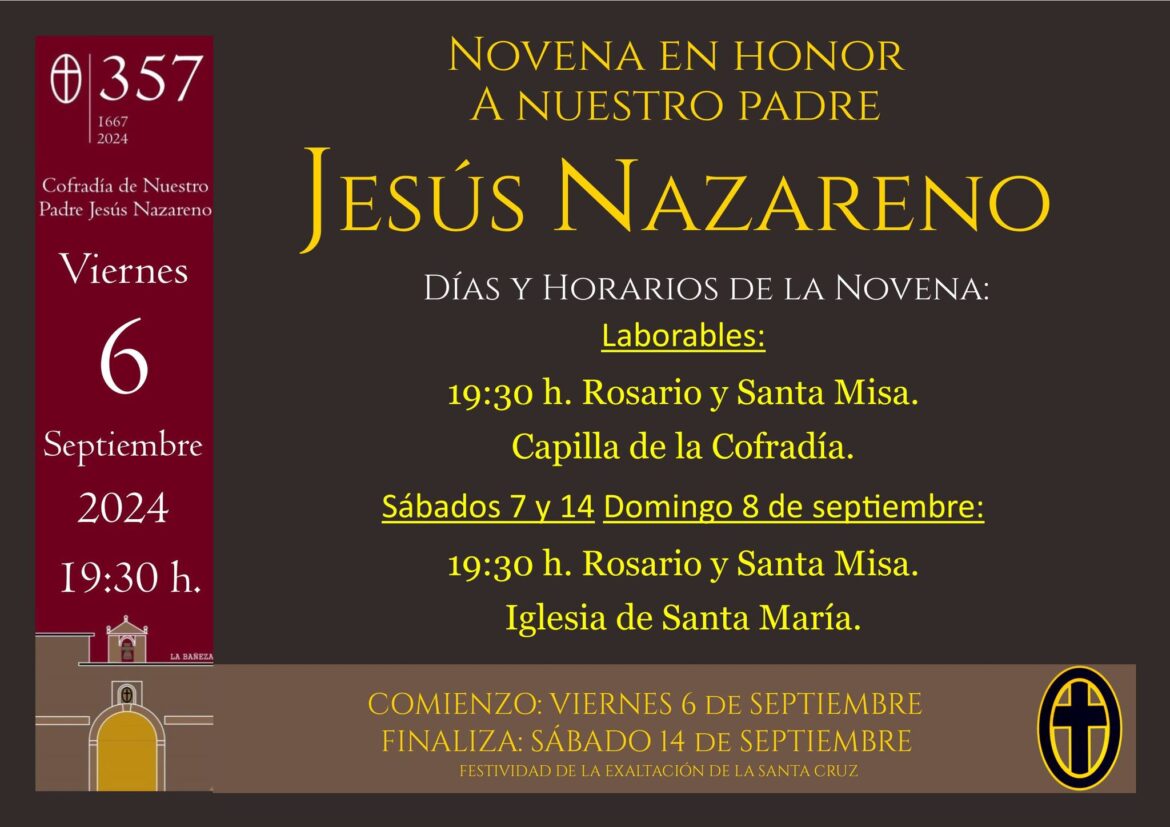 Este viernes 6 de septiembre de 2024, dará inicio la tradicional Novena en honor a Nuestro Padre Jesús Nazareno, organizada por la Cofradía de Jesús Nazareno de La Bañeza. Este año, se conmemoran 357 años desde la fundación de la cofradía, que data de 1667.