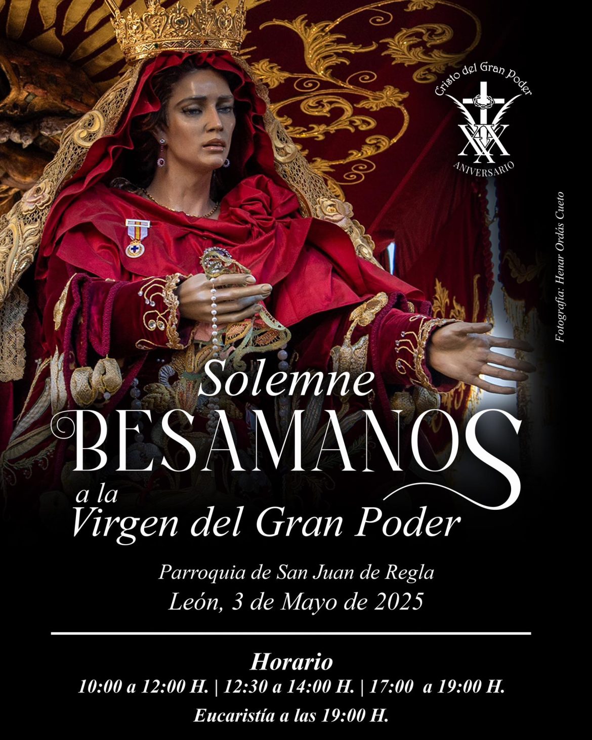 La Cofradía del Cristo del Gran Poder de León ha organizado este sábado 3 de mayo un Solemne Besamanos a la Virgen del Gran Poder que tendrá lugar en la Iglesia de San Juan de Regla.