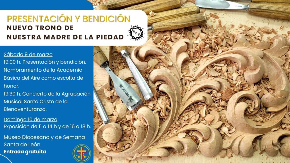 El trono será presentado a las 19:00 horas en el Museo Diocesano y de Semana Santa de León, y durante el transcurso, se nombrará a la Academia Básica del Aire, quienes cada mañana de Jueves Santo acompañan a la imagen, como escolta de honor. A las 19:30 horas la Agrupación Musical Santo Cristo de la Bienaventuranza ofrecerá un pequeño concierto.