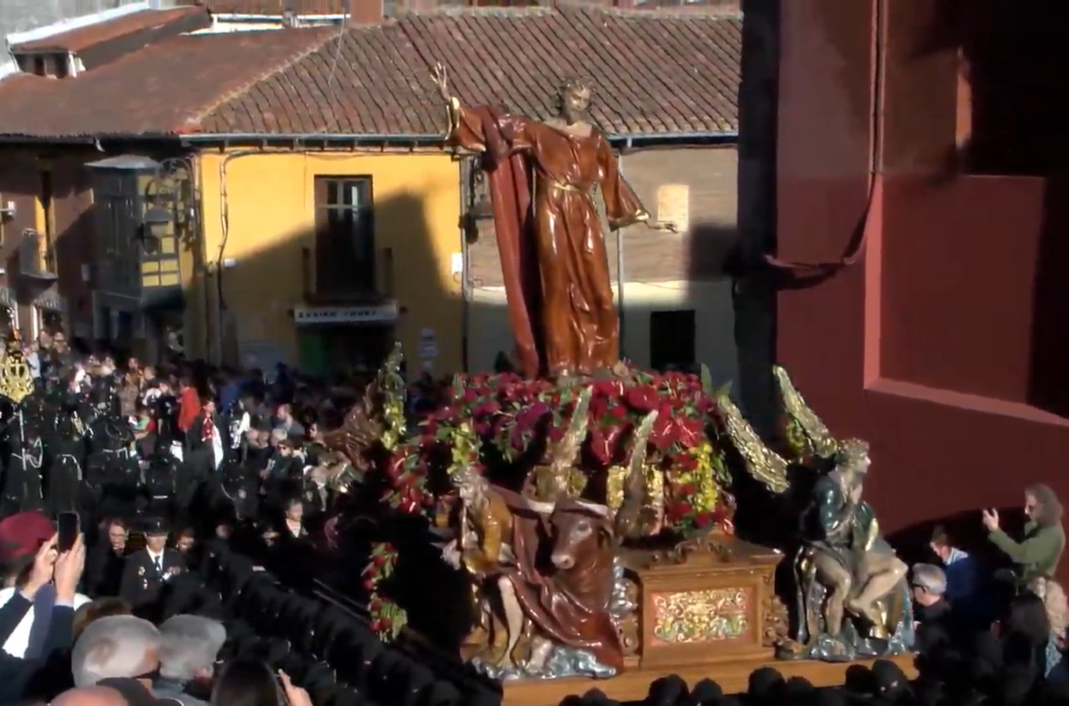 Itinerario: Patio de las HH. Trinitarias, San Lorenzo, San Pedro, Puerta Obispo *ACTO DE LA ENTRADA TRIUNFAL DE JESÚS EN JERUSALÉN* (en la puerta del Palacio Episcopal), Plaza de Regla, Sierra Pambley, Ancha, Varillas, Cardiles, Platerías, Plegarias, Plaza Mayor (sin vuelta),Mariano Dominginguez Berrueta, Plaza de Regla (sin vuelta), Puerta Obispo, San Lorenzo, HH. Trinitarias.