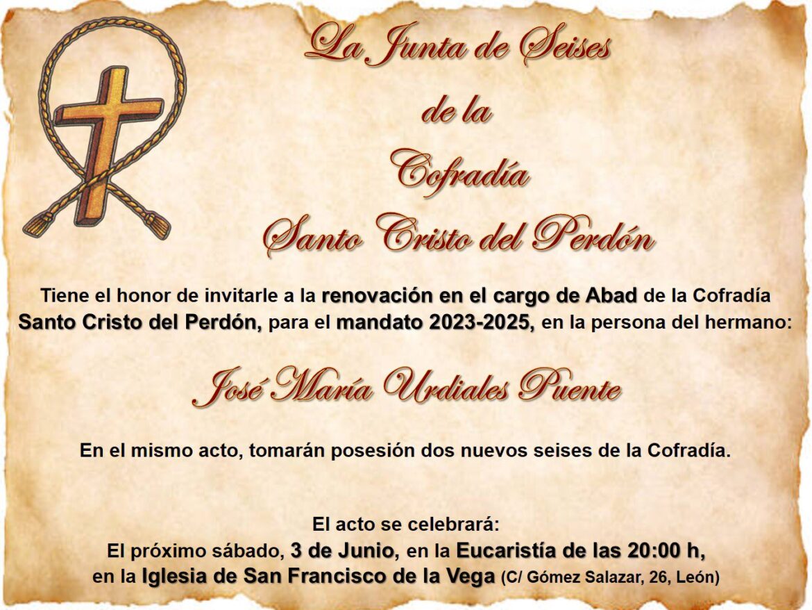 El próximo día 03 de junio, a las 20:00 horas, en la Iglesia Parroquial de San Francisco de la Vega, en la celebración de la Eucaristía, se procederá al acto de Toma de Posesión del cargo de Abad de la Cofradía Santo Cristo del Perdón para el bienio 2023-2025 del actual Abad José María URDIALES PUENTE. En este mismo acto, tomarán posesión como nuevos Seises de la Cofradía, los hermanos, Mara PERAL MARTÍNEZ y José Miguel TIJERA GARCÍA, que recibirán el atributo que les acredita como Seises de la Cofradía.